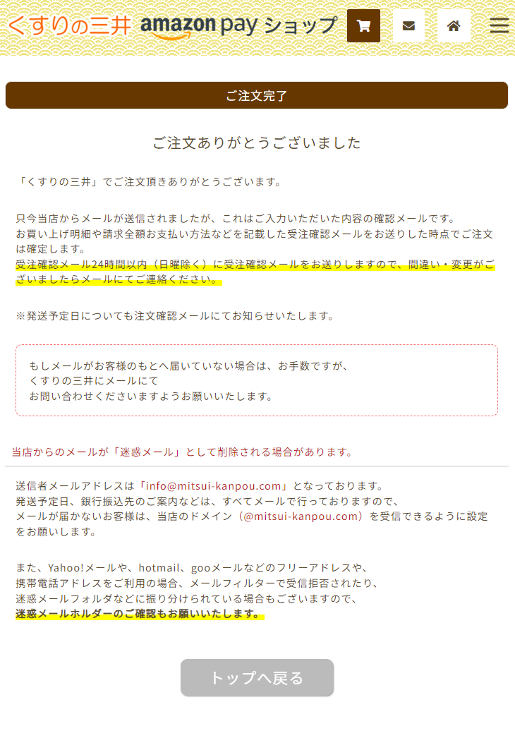 24時間以内(日曜除く)に受注確認メールをお送りします。