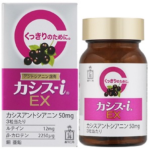 「カシス-iEX」は3粒で、カシスアントシアニン50mg、ルテイン12mg、β-カロテン2,250μgの他、ビタミンE、銅、亜鉛をとることができるカシス抽出物含有食品です。